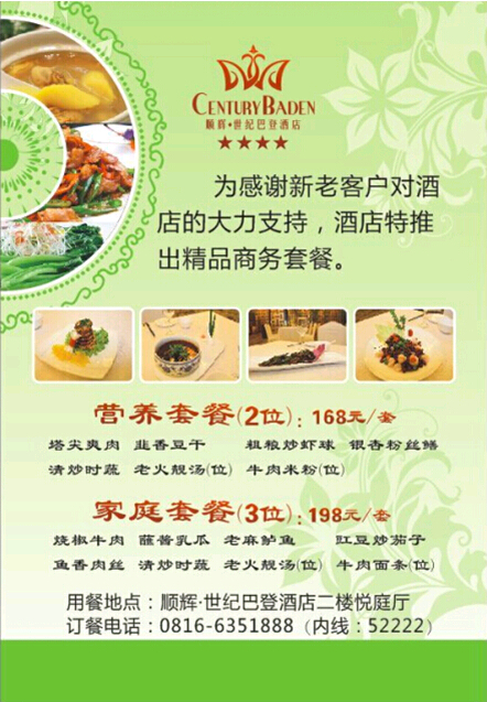 为感谢新老客户对酒店的大力支持,顺辉·世纪巴登酒店特推出精品商务套餐。活动开展已近一个月,酒店不断深化服务、细化产品,得到了广大宾客的一致好评。同时,为满足朋友们挑剔味蕾,提供更加多变的菜品和口味,顺辉·世纪巴登酒店决定不定期修改菜单,提供更多丰富的菜品以供宾客选择。